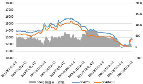4月,不銹鋼現(xiàn)貨市場整體趨熱,304冷、熱軋現(xiàn)貨價格連續(xù)上漲,累計漲幅近1000元/噸。庫存拐頭、成本倒掛、鋼廠封盤待漲等因素帶動現(xiàn)貨市場連續(xù)上漲,市場補庫情緒有所上升。而隨著后期獲利盤資源將逐漸抵達市場,現(xiàn)貨端或?qū)⒅饾u承壓。