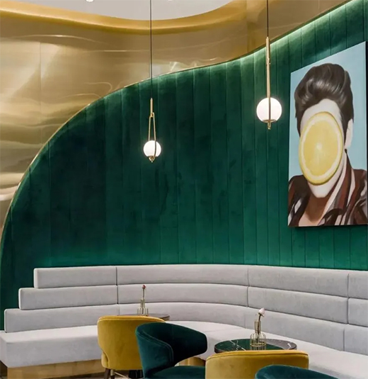 大堂天花使用鏡面的吊頂讓原本不大的空間看上去更高闊明亮,周圍的金屬以曲線性將空間劃分,生動有趣。