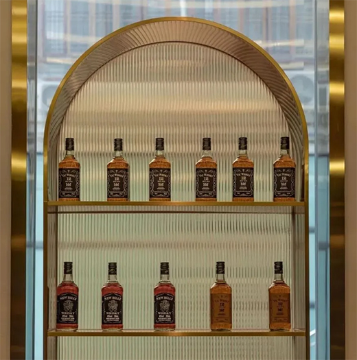 酒架采用拱形門的設(shè)計,背后的玻璃與不銹鋼金屬邊框的結(jié)合,打破了常規(guī)設(shè)計,有種“墻里秋千墻外道”的意境。