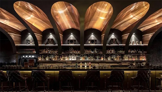酒吧頂部延伸的設(shè)計(jì)來(lái)源于威士忌的原料大麥,大麥屹立生長(zhǎng),達(dá)到一定高度時(shí)向下彎曲,卻依舊不倒,寓意人們生活就算再艱難也要對(duì)未來(lái)充滿幻想,而金屬的設(shè)計(jì)恰好為這“生活”添加色彩。