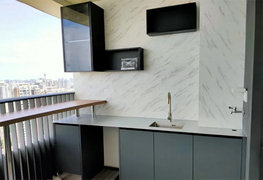 卡利亞身著不銹鋼的衣裳,依然能在美的寬度和深度過程中,挖掘生活所能加持的新鮮意趣。將客戶江景房的陽臺作為洗衣區(qū)和吧臺區(qū)結(jié)合,卡利亞采用5毫米的耐刮劃不銹鋼臺面搭配三邊圓弧的不銹鋼木紋吧臺,背墻采用不銹鋼大理石紋烤漆,配上墻面置物格,在沖擊客戶視覺感官,享受品質(zhì)家居生活之余,也絲毫不用擔(dān)心受潮、發(fā)霉、開裂等隱患,大大提高了空間美觀和使用便捷的基準(zhǔn)線。