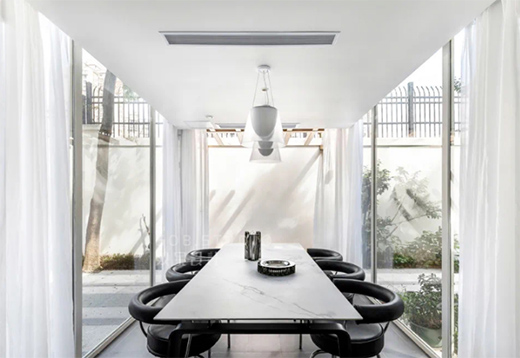 餐廳區(qū)域選在了別墅全景窗的休閑區(qū)處,全落地窗的設(shè)計,讓整個餐廳的采光極佳。而選用白色飄紗加以裝飾,不僅可以保護主人的隱私,還為餐廳增添了仙氣感。讓主人坐在這里用餐不僅可以欣賞外面的風景,還可以有詩情畫意之感~