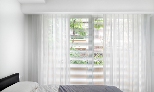 主臥沒有繁雜冗余的裝飾,睡眠區(qū)域只放置一張黑色皮質(zhì)的雙人床搭配一床白灰色的被子就足矣了。窗前用百葉窗加白飄紗打造空間通透溫柔之感,讓整間臥室簡潔又舒適。
