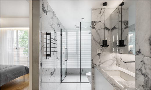 臥室內(nèi)的衛(wèi)生間設(shè)計的十分有ins風格,大理石的集成墻板打造衛(wèi)生間干凈高雅之感,干濕分離的設(shè)計不僅讓空間很好打理,同時也防潮衛(wèi)生。