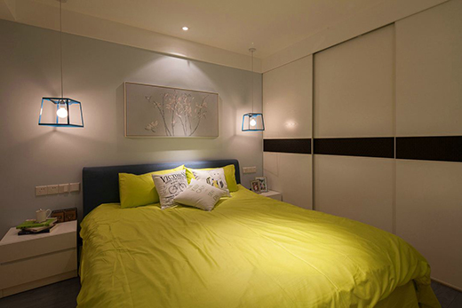 造型簡潔的歐式吸頂燈,發(fā)出乳白色光,與臥室淡色墻壁相映,一片清純。