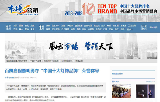 據(jù)《市場(chǎng)與營(yíng)銷》報(bào)道:由《中國(guó)品牌網(wǎng)》主辦的大型全行業(yè)品牌盛事獲獎(jiǎng)榜單出爐,來自世界級(jí)城市群“粵港澳大灣區(qū)”的百凱啟程照明,在與數(shù)百家燈飾品牌的激烈競(jìng)爭(zhēng)中脫穎而出,勇奪“中國(guó)十大燈飾品牌”榮譽(yù)稱號(hào),直登行業(yè)高峰!