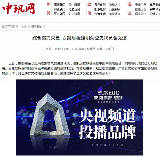《中訊網(wǎng)》報(bào)道:中國(guó)中央電視臺(tái)是我國(guó)的新聞?shì)浾摍C(jī)構(gòu)和思想文化陣地,具有傳播范圍廣、觀眾覆蓋率高、收視率高等其它衛(wèi)視平臺(tái)無(wú)可比擬的優(yōu)越性。近期,百凱啟程照明榮登中國(guó)中央電視臺(tái),向電視機(jī)前的億萬(wàn)觀眾展示百凱啟程照明的優(yōu)異品牌形象及獨(dú)特品牌魅力。