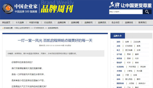《中國(guó)企業(yè)家?品牌周刊》刊載報(bào)道:多年來,百凱啟程團(tuán)隊(duì)始終站在消費(fèi)者的角度看問題,并憑借敏銳的市場(chǎng)觸覺與成熟的設(shè)計(jì)水平致力于時(shí)尚產(chǎn)品的研發(fā)生產(chǎn),接連不斷地向市場(chǎng)輸送別具一格的照明臻品。