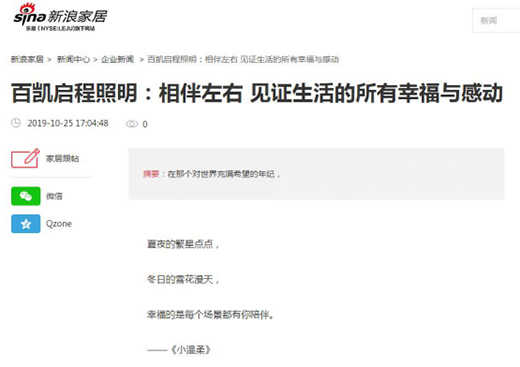 《新浪家居》講述某位消費(fèi)者的故事:幸福的每個(gè)場(chǎng)景,都與百凱啟程照明有關(guān)。