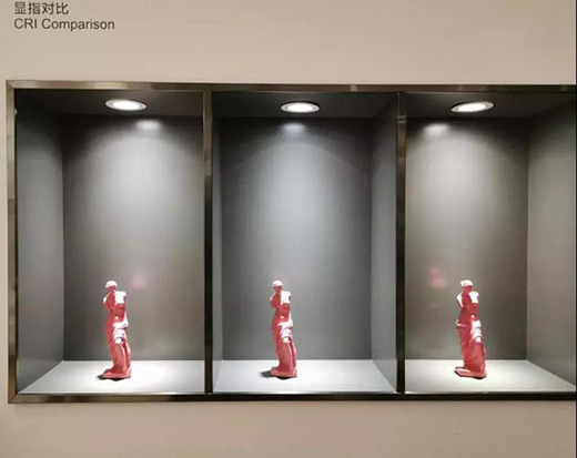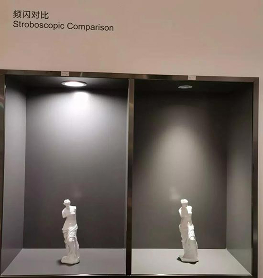 形象店將產(chǎn)品陳列與光效體驗有機融合,便于來訪客戶比對照明效果進而進行產(chǎn)品選樣,同時還分別展示了在不同燈光下顯指、頻閃、防眩的對比情況,結果顯示,顯色指數(shù)大于90的燈具能夠最真實的還原物體本身色彩,雷士燈具光色純正且無頻閃,具有防眩的效果,有利于穩(wěn)定人的情緒,營造溫馨生活空間。