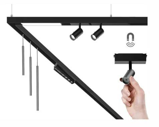客廳區(qū)域的左面,展示了燈具的磁吸技術。燈具可通過磁力沿整個軌道固定,不需要任何工具來安裝。