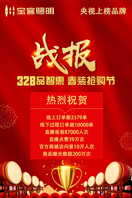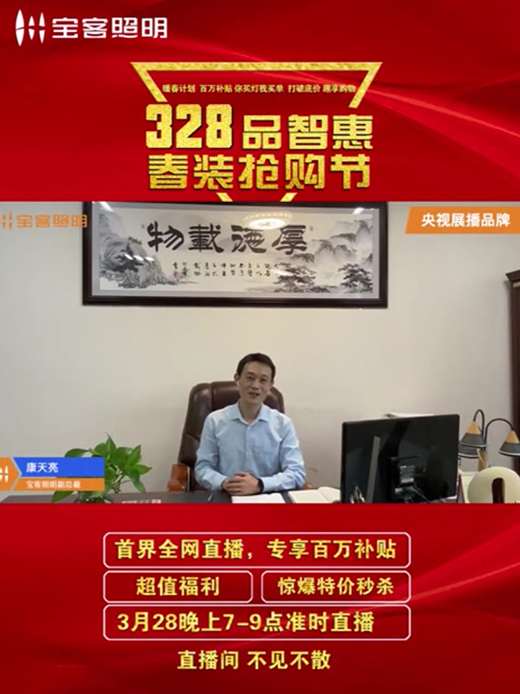 國(guó)內(nèi)市場(chǎng)受疫情影響,線(xiàn)下銷(xiāo)售普遍低迷,寶客照明果斷作出策略調(diào)整、創(chuàng)新?tīng)I(yíng)銷(xiāo)方式:借助春季裝修熱的大好時(shí)機(jī),快速啟動(dòng)“328品智惠—春裝搶購(gòu)節(jié)”網(wǎng)絡(luò)直播促銷(xiāo)活動(dòng)。