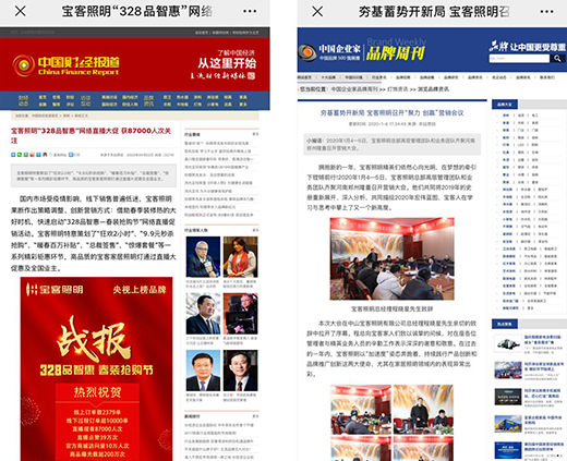 家居照明,占據(jù)家庭裝修的重要地位,人們?cè)谫徶脮r(shí)往往經(jīng)過慎重考慮,在身處產(chǎn)品多如牛毛的燈飾市場(chǎng)中,企業(yè)在關(guān)鍵時(shí)刻能否取勝,也在乎平日的品牌美譽(yù)積累。寶客照明近年來整合營(yíng)銷規(guī)劃逐步落地,通過搜索引擎、網(wǎng)絡(luò)媒介、流量視頻、央視頻道、高端紙媒等傳播平臺(tái)進(jìn)行全方面、持續(xù)性的品牌宣傳,不斷增強(qiáng)大眾對(duì)寶客品牌的感知認(rèn)可度以及品牌的核心競(jìng)爭(zhēng)力,以此為終端銷售添加“燃料”。