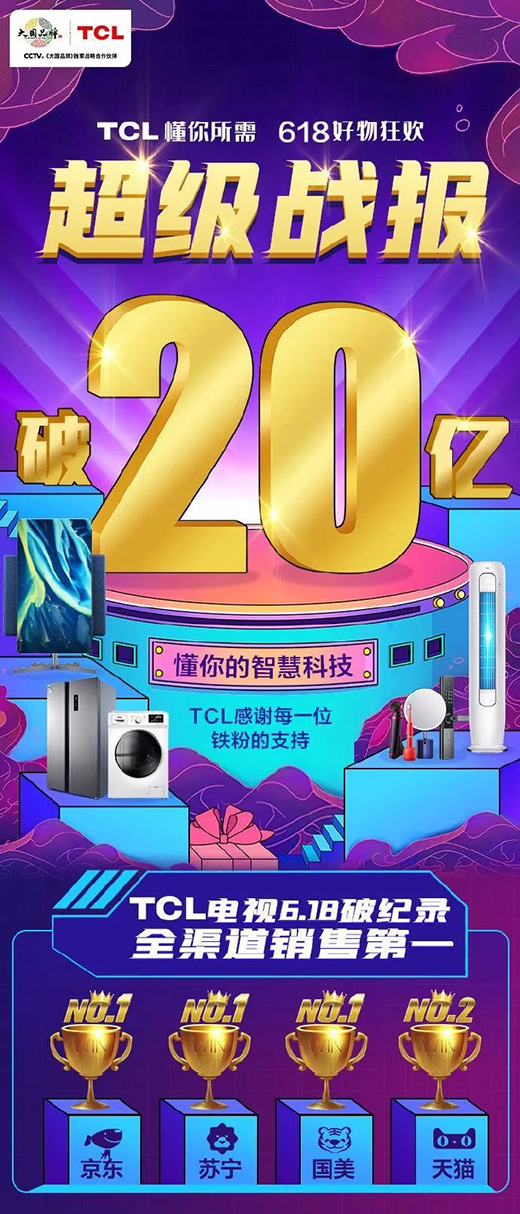 疫情之下,逆勢(shì)向上,截至6月18日23點(diǎn)55分,TCL全品類(lèi)成交額突破20億,TCL電視618破紀(jì)錄全渠道第一!