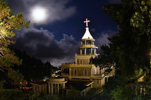 鼓嶺教堂夜間少有游客游覽,坡道兩側(cè)布設(shè)了連貫的照明燈帶,方便游客夜間散步。鼓嶺教堂的圓錐形屋頂,在燈光的映照下,熠熠生輝。