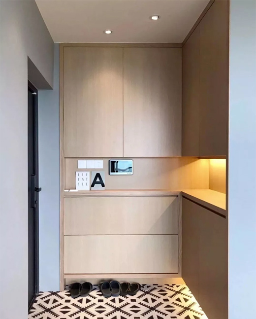 玄關(guān)柜中間一般都會(huì)留出一個(gè)空間來(lái)放小物件,而玄關(guān)處常見(jiàn)燈光就是玄關(guān)吊頂處的一個(gè)燈。因此還可以在玄關(guān)柜中間安裝一個(gè)感應(yīng)櫥柜燈,晚上回家,一開(kāi)門(mén)燈就會(huì)亮,不用摸黑找開(kāi)關(guān),也給人安心和溫暖的感覺(jué)。玄關(guān)柜底部做抬高,一來(lái)可以方便放鞋子,二來(lái)同樣也可以安裝櫥柜燈,突出使用場(chǎng)景,和玄關(guān)柜中間燈光做呼應(yīng)。同時(shí),柜底宜琳櫥柜燈也讓玄關(guān)處更有層次感,一進(jìn)門(mén)就給人非常明亮又溫馨的體驗(yàn)。