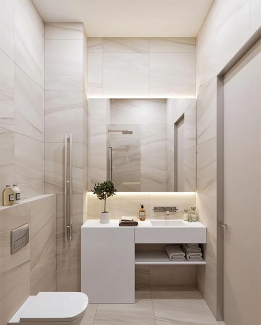 鏡柜下燈光和鏡柜頂部功能不同,這里的燈光,一方面是更清晰分辨臺(tái)面上或者壁掛墻面上的物品;另一方面,燈光從底部打出來(lái),把墻面照亮,會(huì)有視覺(jué)誤差感,顯得臺(tái)面更寬敞。
