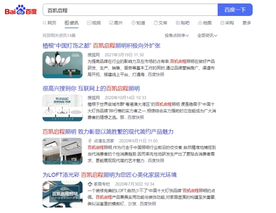通過百度、360、搜狗等搜索引擎,我們輕易便能找到百凱啟程照明品牌的身影。由于時間關(guān)系,我們今天就暫且不看其他內(nèi)容,先把目光聚焦到百度資訊上。