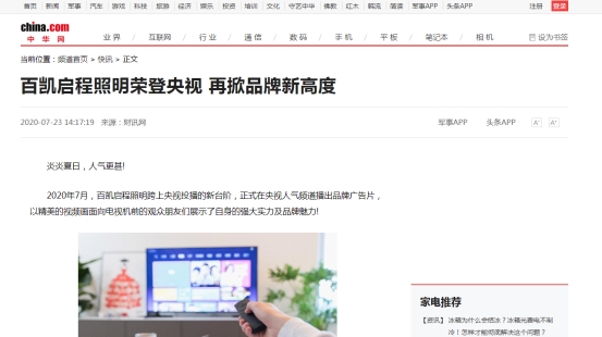 由代表中國名聲和形象的國家級門戶網(wǎng)站《中華網(wǎng)》報道的這一篇文章,以一個醒目的標(biāo)題《百凱啟程照明榮登央視 再掀品牌新高度》成功吸引了一大批網(wǎng)友的注意。文章既明確傳達(dá)了百凱啟程照明曾在央視人氣頻道播出品牌廣告片的信息,又側(cè)面透露出百凱啟程品牌的強勁綜合實力,讓閱讀過文章的網(wǎng)友對百凱啟程有了更多的好感與消費欲望。
