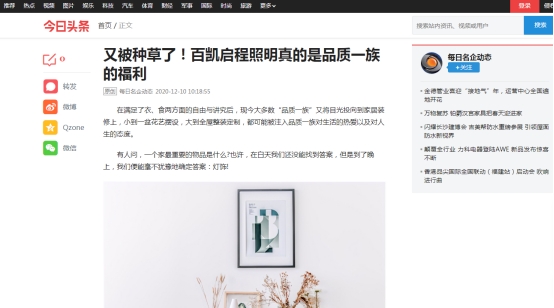 再看這篇由知名信息媒體平臺《今日頭條》報道的文章:《又被種草了!百凱啟程照明真的是品質(zhì)一族的福利》,以整理展示消費者熱門評論的方式為大家展示了百凱啟程照明信得過的好品質(zhì)和更超群的好設(shè)計,著實讓不少網(wǎng)友在閱讀過后真的被“種草”了。