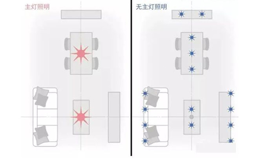 無(wú)主燈的多點(diǎn)式照明設(shè)計(jì)指的是在沒(méi)有主燈的情況下,根據(jù)空間不同需求以點(diǎn)、線、面結(jié)合的方式,對(duì)天花、墻面、地面進(jìn)行多界面多層次的照明方式,一般選擇安裝筒燈、射燈、燈帶等小型燈具。多點(diǎn)式照明的優(yōu)點(diǎn)是比主燈照明光線照射更均勻,視覺(jué)效果更多變靈活,能讓整個(gè)空間更有層次感和格調(diào)。