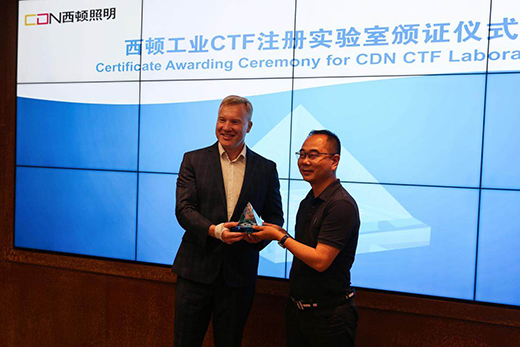 2021年5月11日,西頓照明與德國萊茵TüV集團(tuán)“CTF注冊實驗室”頒證儀式在西頓(惠州)總部光之家展廳舉行。