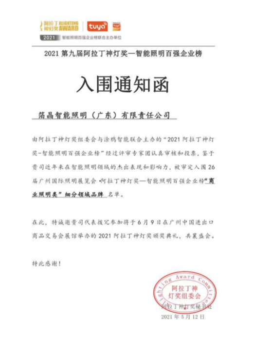 BOJO箔晶成功入圍阿拉丁神燈獎——智能照明百強企業(yè)榜