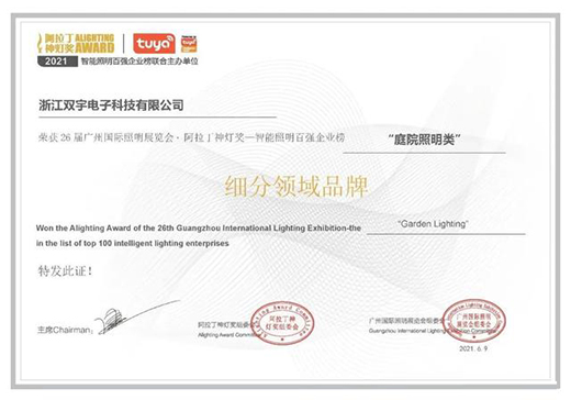 2021阿拉丁神燈獎智能照明百強(qiáng)企業(yè)雙宇電子上榜證書
