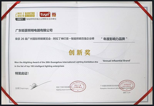 光之榮耀 | 鉅豪喜獲智能照明“年度影響力品牌”創(chuàng)新獎