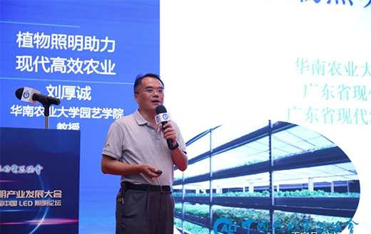 華南農(nóng)業(yè)大學園藝學院教授劉厚誠報告題為《植物照明助力現(xiàn)代高效農(nóng)業(yè)》,分析光環(huán)境對不同蔬菜育苗及病蟲害的影響,介紹了目前快速育種的光環(huán)境的實驗的進展情況。