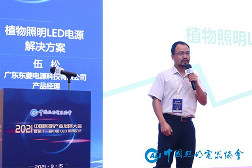 廣東東菱電源科技有限公司產(chǎn)品經(jīng)理伍松以《植物照明LED電源解決方案》為題,對LED植物照明市場、應(yīng)用及相關(guān)行業(yè)標準進行分析,并介紹了企業(yè)相關(guān)產(chǎn)品的特點。