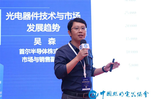 首爾半導體株式會社市場與銷售副總裁吳森進行了題為《照明用光電器件的技術(shù)與市場趨勢》的報告。他結(jié)合數(shù)據(jù)對LED照明市場發(fā)展趨勢進行了分析,并表示,過去幾年內(nèi)全球LED的格局發(fā)生了巨大變化,目前在全球范圍內(nèi)中國LED制造商已占40%。