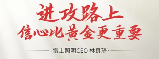 有一句話叫做“信心比黃金更重要”。疫情常態(tài)化等不可抗力因素,讓所有企業(yè)遭遇的困難基本一致,也是對企業(yè)抗風險能力與創(chuàng)新應(yīng)變能力的一次檢驗。這個時候,我們一定要增強信心,用辯證的思維來看待危機背后的機會,每一次危機都是行業(yè)的洗牌,強者恒強。我們要對中國經(jīng)濟有信心,對照明行業(yè)有信心,對雷士照明的未來有信心。