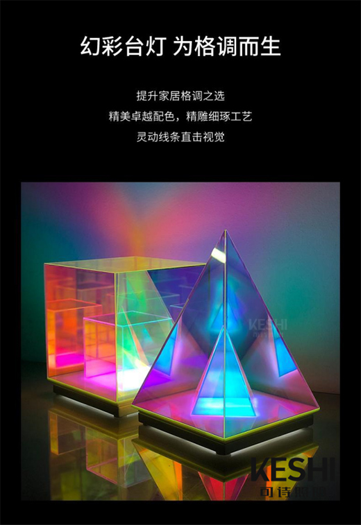 創(chuàng)意幻彩氛圍臺燈有兩種款式可選,分別是金字塔款和水立方款,無論是關(guān)燈效果還是白天開燈效果、夜間開燈效果都極具有藝術(shù)感,相信定能成為房間里的一道靚麗風景。別以為這款產(chǎn)品只是徒有其表,但其實材質(zhì)、工藝都堪稱是上乘的。
