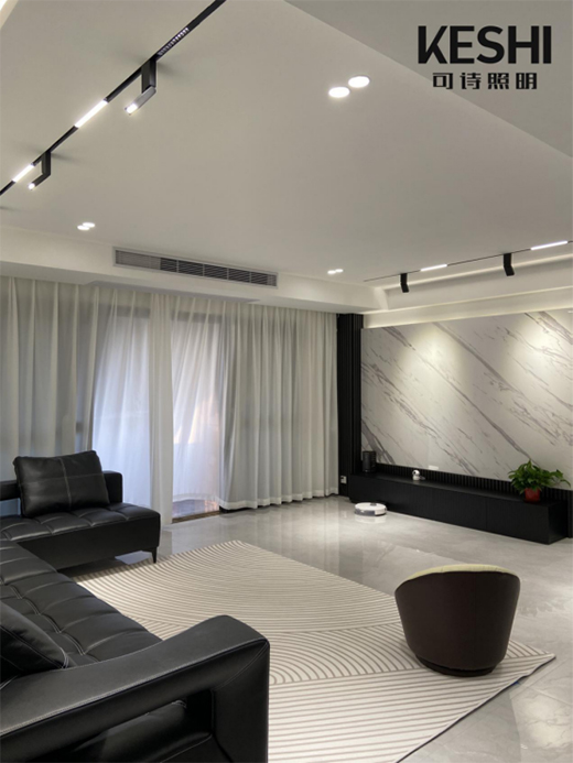寬敞的大客廳,采用8盞6W的防眩射燈提供基礎(chǔ)照明,既能局部分散照明區(qū)域,又確保空間整體的明亮感。再采用平行布局的兩排磁吸軌道燈作補(bǔ)充照明,其中折疊款磁吸軌道射燈指哪亮哪,用其打亮沙發(fā)背景墻及電視背景墻,能讓室內(nèi)照明更具層次感。另外,雙邊燈槽吊頂搭配上明裝暗藏式燈帶,很好地營(yíng)造出情調(diào)感滿滿的客廳氛圍。這個(gè)寬敞又明亮的大客廳,真是整個(gè)家的高檔大氣擔(dān)當(dāng)。