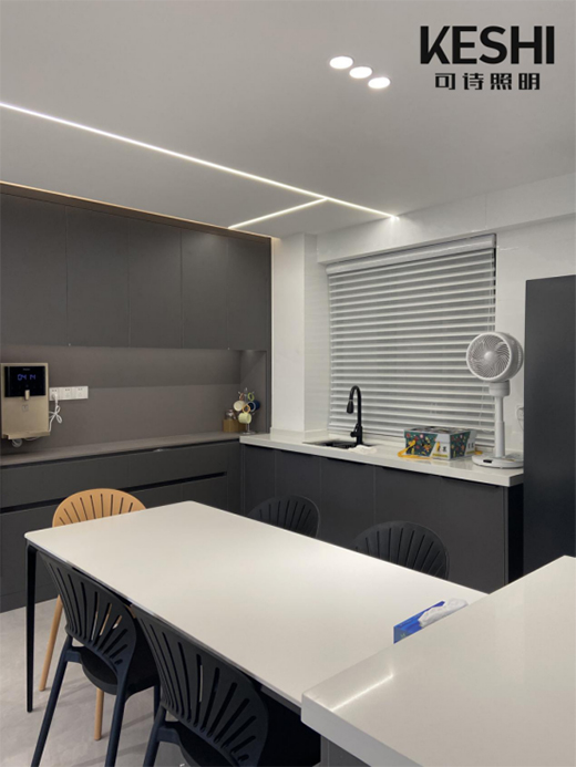 再在吊頂上安裝好預(yù)埋式線性燈,裝飾天花,延伸視線,素靜的餐廳馬上變得藝術(shù)感十足。