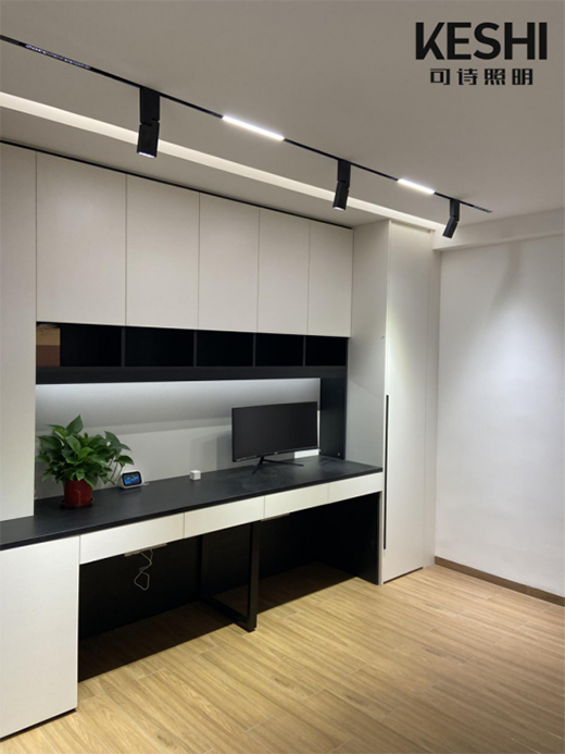 書(shū)房采用單排的預(yù)埋式磁吸軌道燈,應(yīng)用上折疊射燈與泛光款磁吸燈,為讀書(shū)、看電腦、寫(xiě)字等活動(dòng)提供了充足的光照。又因磁吸軌道燈靈活性較高,可隨心移動(dòng)更換燈具,也給家人在書(shū)房的日常活動(dòng)提供了更高的自由度,圍在書(shū)桌前一起討論工作,可以!在遠(yuǎn)處地板上做瑜伽,可以!在書(shū)柜上擺放喜愛(ài)的藏品,用燈光打亮,也可以!哪里需要光,就讓光往哪里去。