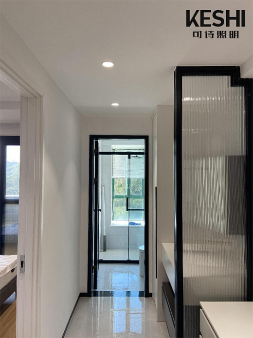 過(guò)道處的燈光布局相對(duì)比較簡(jiǎn)單,比如這個(gè)連接衛(wèi)浴間的過(guò)道,采用的就是6W的防眩射燈,既能為這空間提供相應(yīng)的光亮,而燈光照耀到墻上,又顯示出漂亮的光弧,瞬間讓潔白普通的墻面變得與眾不同,這也許就是光作為第四建材的魅力。