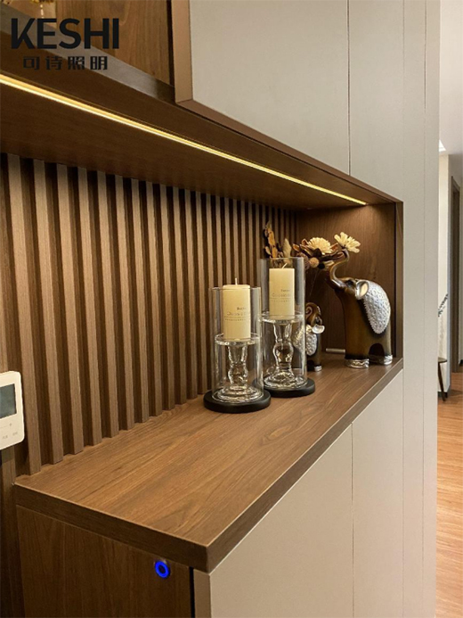玄關(guān)柜安裝了感應(yīng)柜燈,采用的是觸摸開關(guān),使用起來更便捷。有了線條燈的點(diǎn)綴,整個(gè)柜子的造型感更強(qiáng),讓玄關(guān)也能成為一道令人矚目的風(fēng)景線,且線條燈的延伸也讓人覺得玄關(guān)變得更為寬敞綿長起來,從視覺上看,空間延伸感更強(qiáng)。