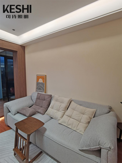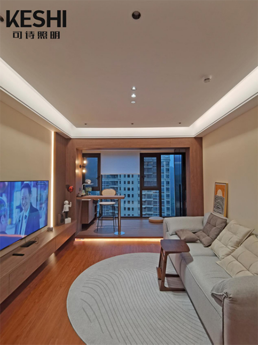 除線條燈外,吊頂上還安裝了筒燈作為基礎(chǔ)照明,又在客廳中央以三盞射燈作為重點(diǎn)照明,重點(diǎn)照射中央?yún)^(qū)域,以此來展現(xiàn)光線的層次感。