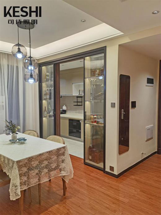 值得一提的是,廚房的玻璃門別有玄機(jī)。平常拉開門時(shí),玻璃門是酒柜門,而拉上門時(shí),玻璃門又能作為廚房門,一門兩用,著實(shí)巧妙。