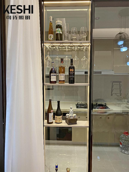 為了突出酒柜所存放物品的質(zhì)感,酒柜的每一格都安裝上了柜燈,燈一打亮,昂貴的美酒和高腳杯便仿佛是登上了璀璨舞臺的演員,勾得人舍不得移開眼。