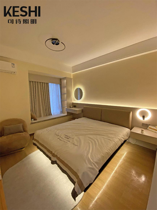主臥中最讓人驚喜的,一定是床底感應(yīng)燈,只要一有人靠近,感應(yīng)燈便會自動亮起,照亮腳下,這樣主人在夜間起床也不用擔(dān)心會找不到拖鞋或有摔倒的風(fēng)險(xiǎn)了。而床頭背景板與客廳背景板有異曲同工之妙,無需特別的裝飾,只需運(yùn)用上線條燈便能達(dá)到簡約但并不簡單的光影效果。難怪專家說,“光是第四建材”。