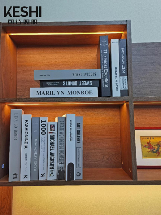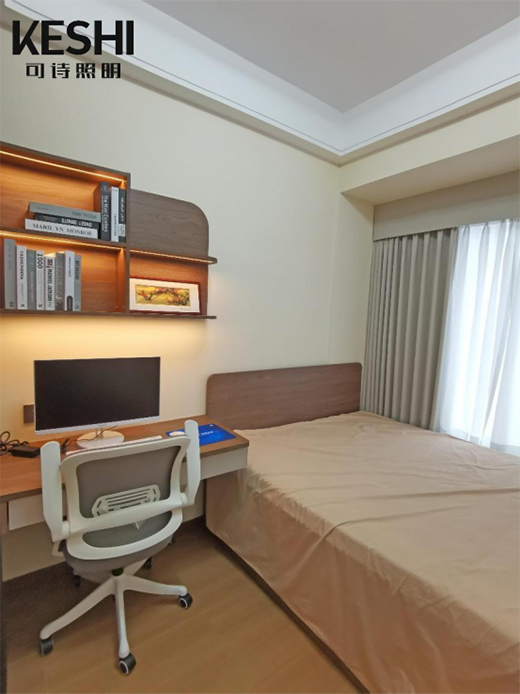 次臥中最吸引人注意的當(dāng)屬書柜。在書柜中安裝上超薄明裝式線條燈,觸摸感應(yīng)開關(guān),便利日常讀書學(xué)習(xí)。在開燈前,書柜平凡,書籍昏暗,讓人提不起學(xué)習(xí)的勁,而開燈后,燈光打在書籍上,質(zhì)感提升,竟讓人產(chǎn)生了要馬上翻閱找尋書中是否有黃金屋與顏如玉的興致。