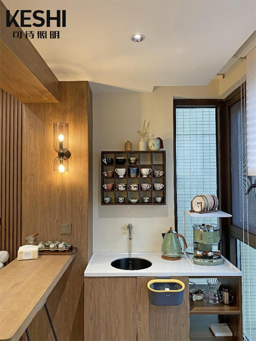 陽臺以2個(gè)防眩筒燈作為基礎(chǔ)照明,再加上壁燈,便已情調(diào)滿滿。