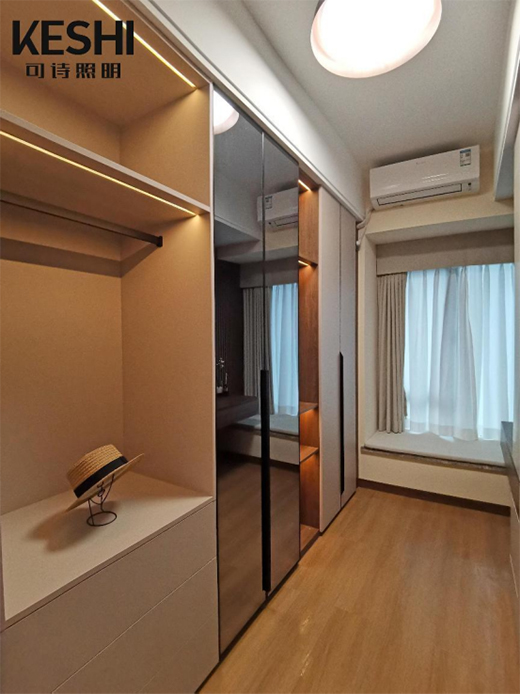 獨(dú)立的衣帽間則是女主人最愛的空間,里面存滿女主人心愛的衣服、包包還有其他裝扮配飾。衣帽間也做了分區(qū)域設(shè)計(jì),部分有安裝密閉柜門,另一部分區(qū)域則為敞開式。而為了更好地展現(xiàn)配飾的質(zhì)感,以及方便日常取放物,敞開式的衣柜也同樣安裝上了感應(yīng)式柜燈。