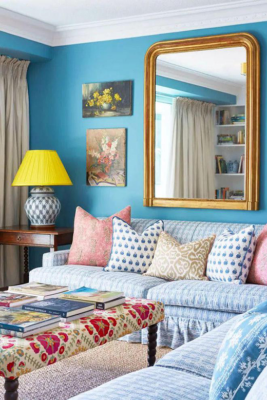 設(shè)計師Anna Spiro Design設(shè)計的這個多彩起居室中的百褶檸檬黃色燈罩位于頂部。盡管有趣的靠包和腳凳,優(yōu)雅的鍍金鏡面和明亮的藍色墻壁使空間變得有趣和誘人,但真正使它時尚的卻是燈。