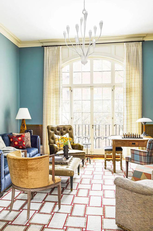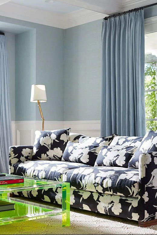 盡管經(jīng)典的落地?zé)粼黾恿艘恍┢恋墓ぷ髡彰?,但由設(shè)計師Heather Hilliard增添了一些意想不到的前衛(wèi)元素,在起居室的天花板上加入了嵌入式照明,這才真正使這間客廳明亮起來?;ㄊ缴嘲l(fā)和綠色螢石茶幾令人驚喜,可以打破經(jīng)典元素而又不至于使它們受壓。
