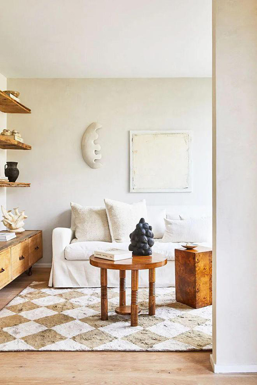 選擇雕塑般的壁角照明,兼作藝術(shù)品,為您的客廳墻壁增光添彩。這是一種擴大像這樣的簡約客廳的特別有效的方法。