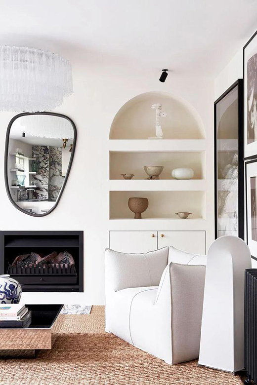 現(xiàn)代和簡約的空間,例如開放式閣樓或新開發(fā)的建筑,可以通過泥土色調(diào),豪華的材料層和巧妙的配件進行熱身。在這里,Tamsin Johnson擁有前衛(wèi)的鏡子和低矮的鍍鉻茶幾,保持了前衛(wèi)的氛圍。她還通過安裝內(nèi)置的光滑黑色聚光燈增加了額外的照明。